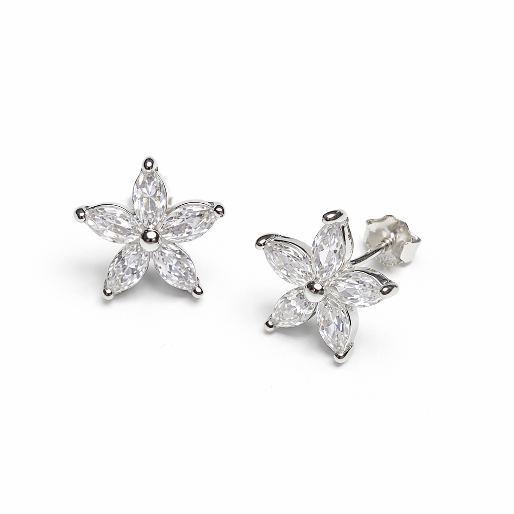 Elegantne srebrne minđuše u obliku cveta odišu nežnošću i sofisticiranim sjajem. Dizajn je sastavljen od belih cirkona u obliku latica, precizno postavljenih tako da formiraju blistav cvet koji reflektuje svetlost iz svakog ugla.