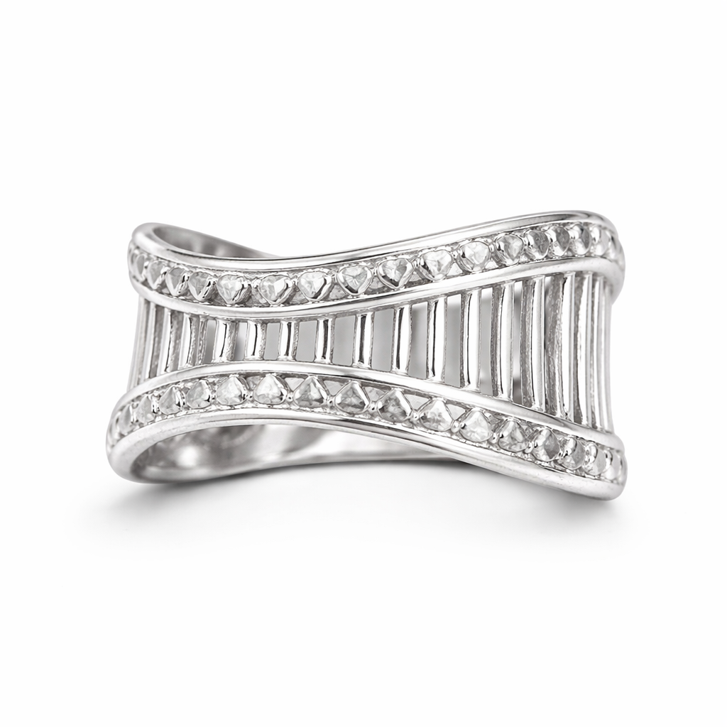 Ovaj sofisticirani srebrni prsten odlikuje se modernim talasastim dizajnom koji odiše elegancijom i luksuzom. Centralni deo čini otvorena struktura sa vertikalnim linijama koje prstenu daju savremen i jedinstven izgled.