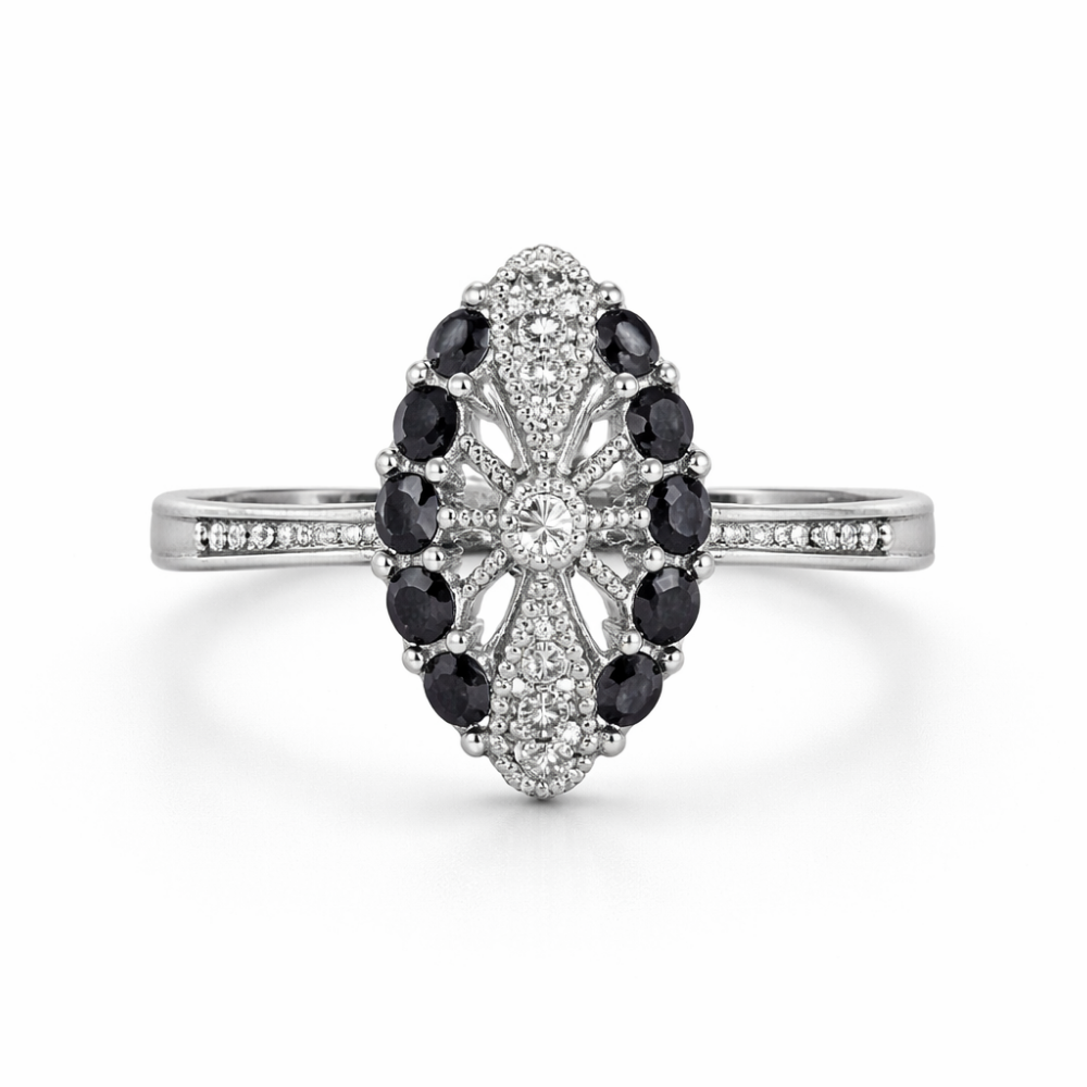 Srebrni prsten sa crnim i belim cirkonima – vintage marquise dizajn